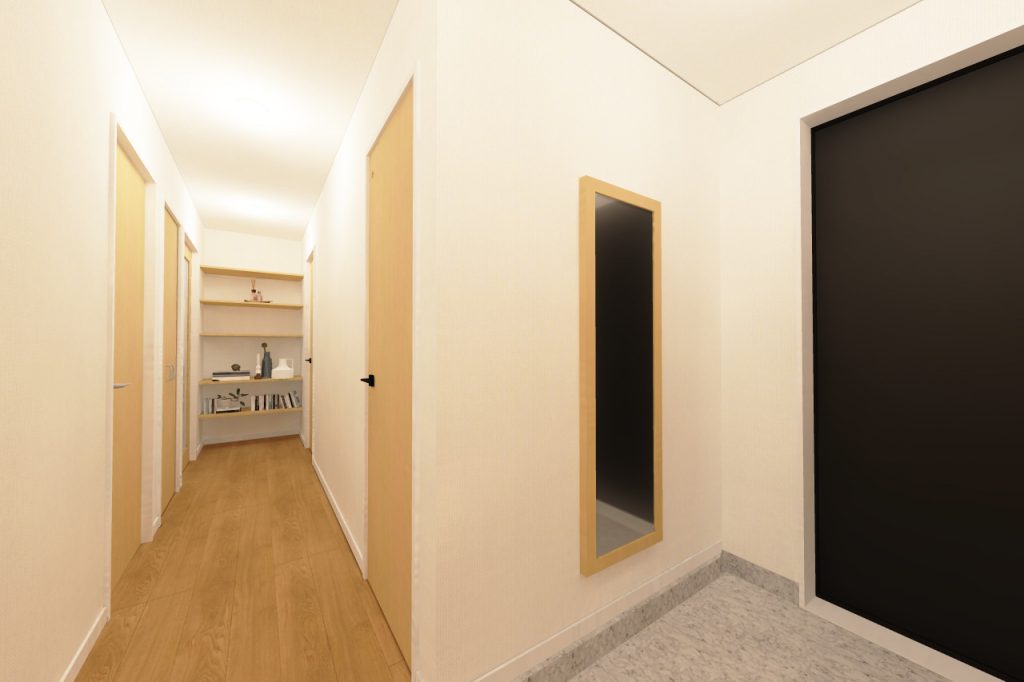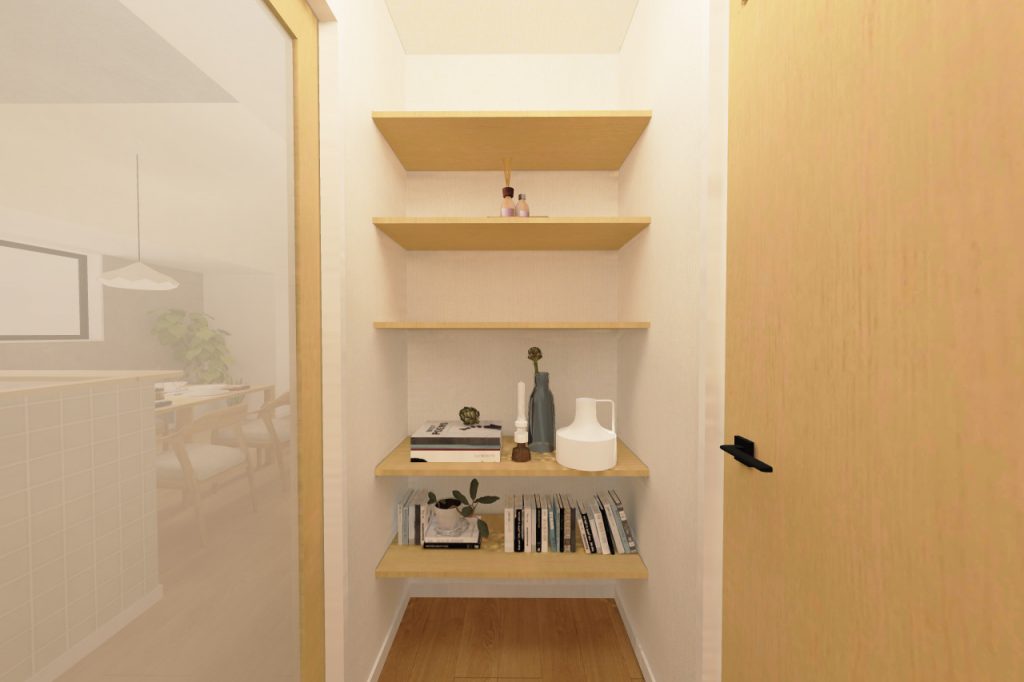廊下突き当りのデットスペースにも、棚を付け足して収納スペースに!