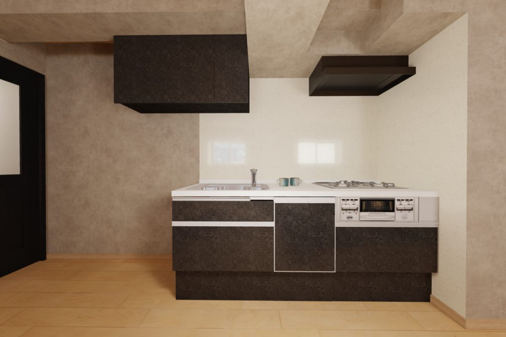 キッチンはこんな感じになります。扉にシックな色味のシートを貼ってカラーチェンジしました。