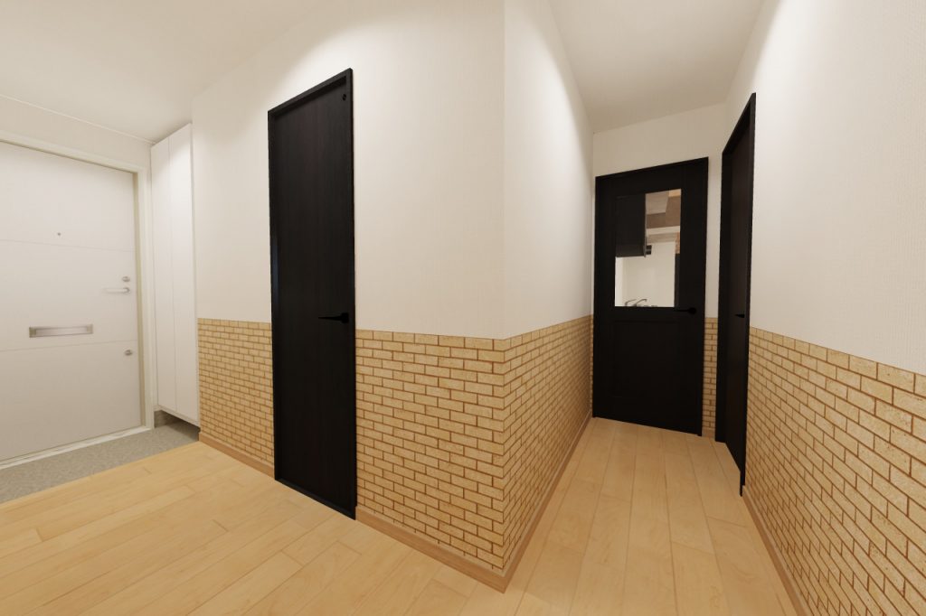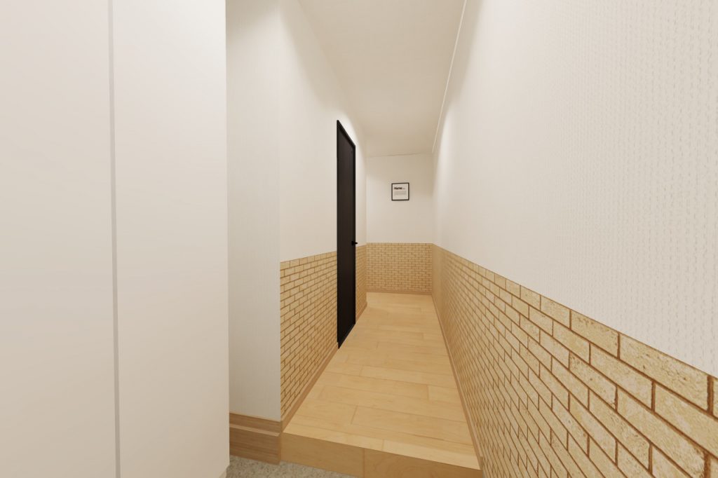 玄関から見渡すと、腰高までのレンガクロスがあなたをお出迎え。