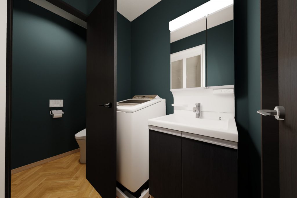 黒の建具と深緑のクロス、またクッションフロアのヘリンボーン柄も相まって、おしゃれに上品に仕上がっています!